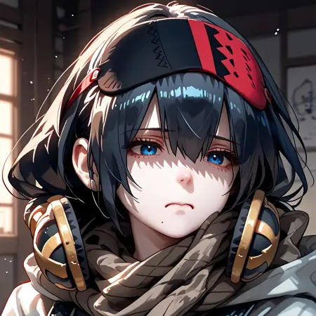默认服装: defaultcecile、肤色苍白、黑发、长发、眼罩、头戴眼罩、头戴睡眠眼罩、耳机、围巾、敞开的夹克、露肩、胸部、上衣、腹部、肚脐、红色手套、长裤、靴子,