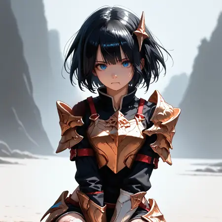 年轻骑士服装: rookiececile、黑发、短发、发饰、盔甲、肩甲、黑色手套、露指手套、过膝长袜、装甲靴,