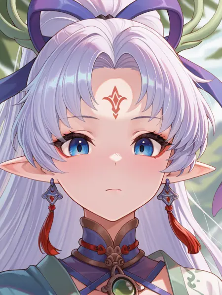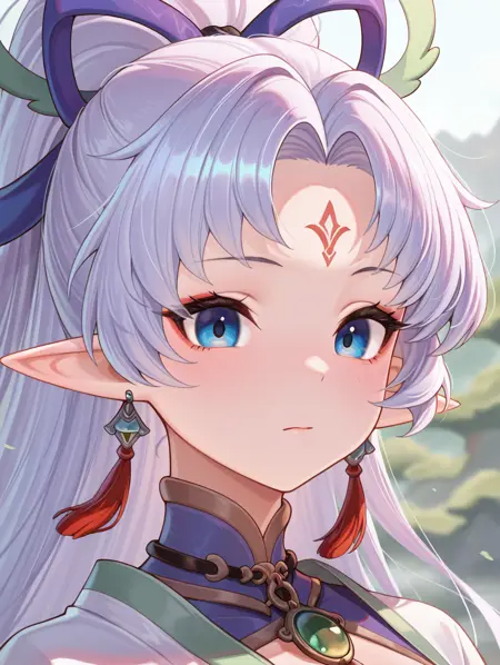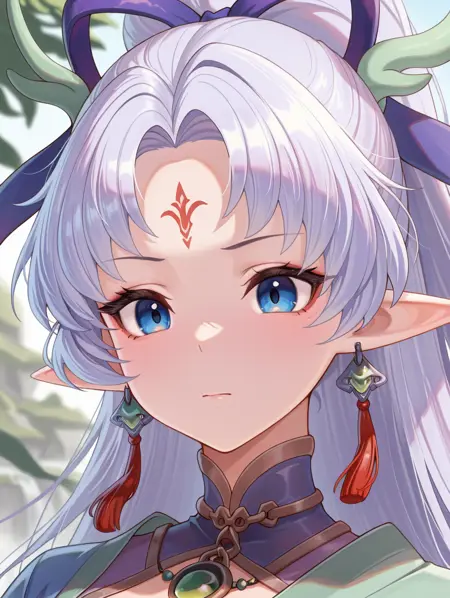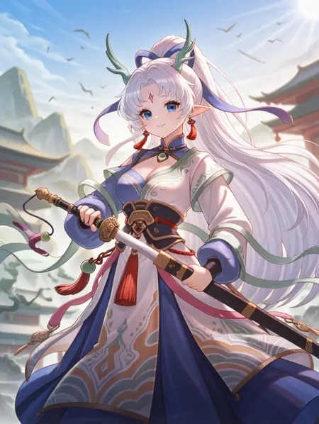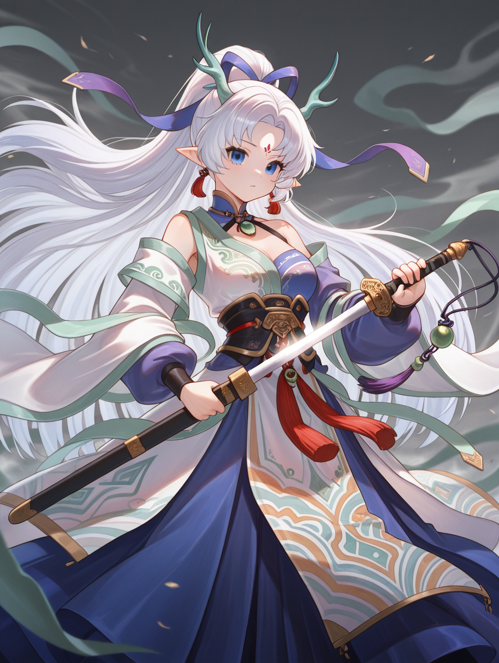 yun, 1girl, 单人, 长发, 蓝眼睛, 持握, 裸露肩膀, 珠宝, 极长发, 马尾, 武器, 白发, 分离袖子, 日式服装, 角, 尖耳朵, 持握武器, 持剑, 刀剑