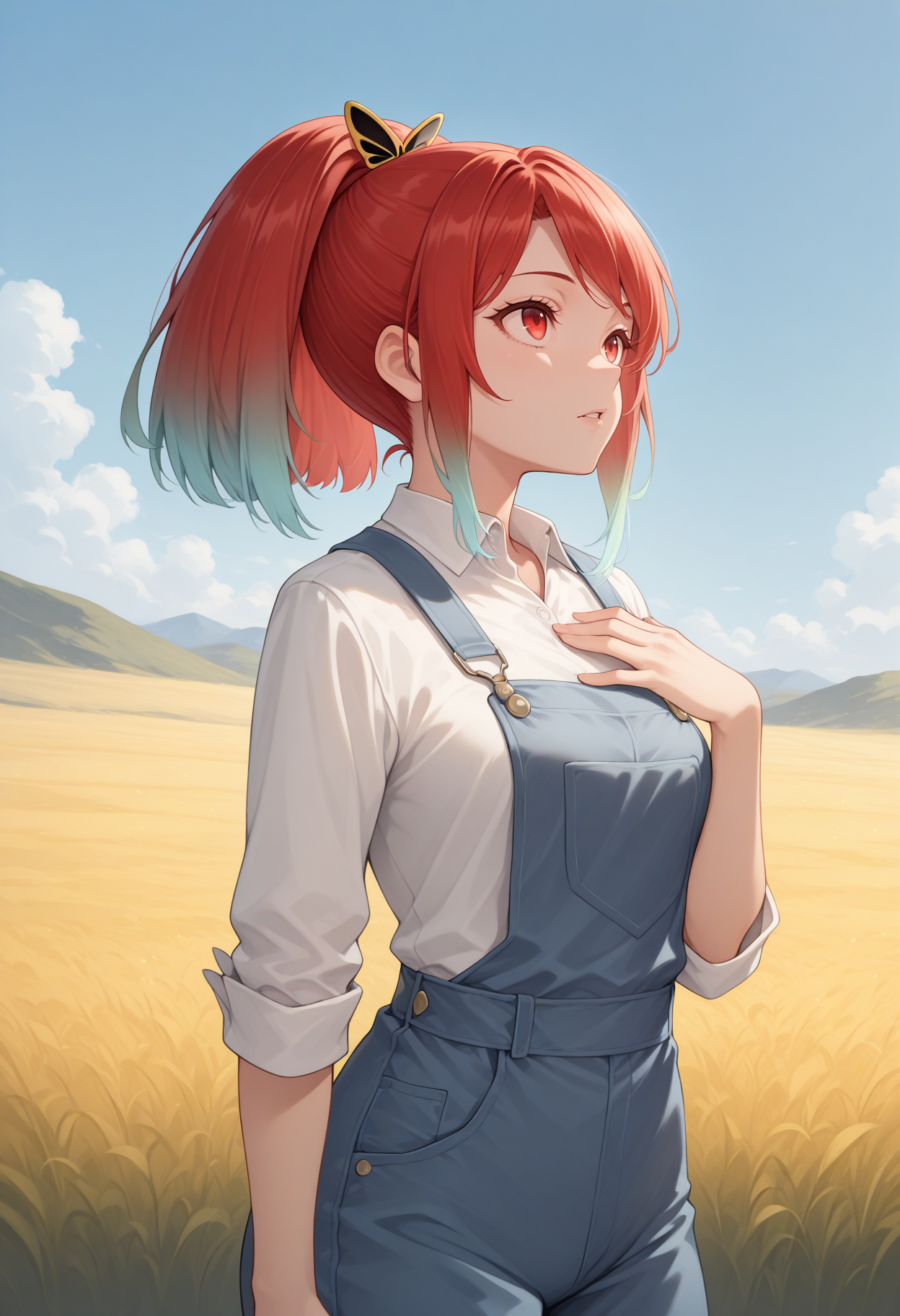 Custom outfit: seresToB, red hair, gradient hair, sidelocks, wide ponytail, butterfly hair ornament, red eyes