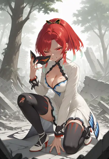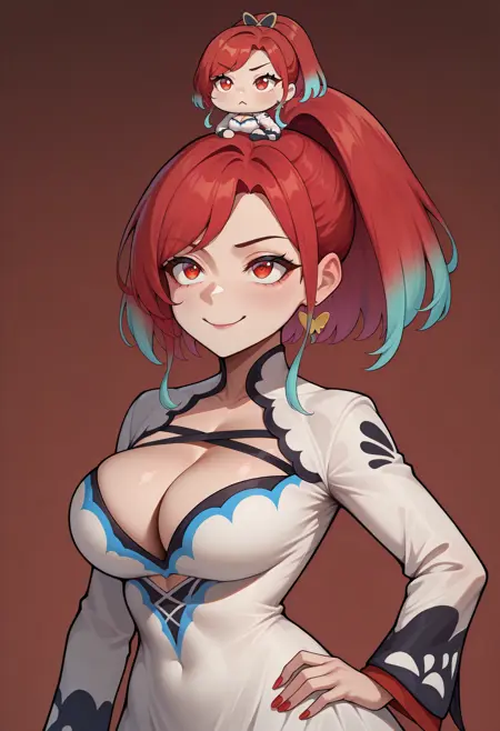 Default appearance: seresToB, red hair, gradient hair, sidelocks, wide ponytail, butterfly hair ornament, red eyes, butterfly earrings, white dress, cleavage, chest strap, long sleeves, red nails, black thighhighs