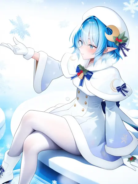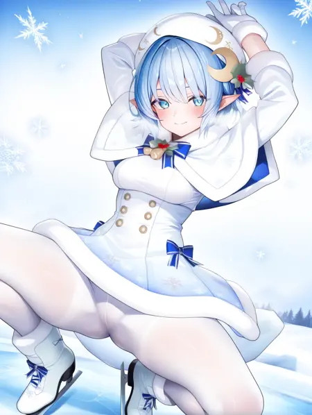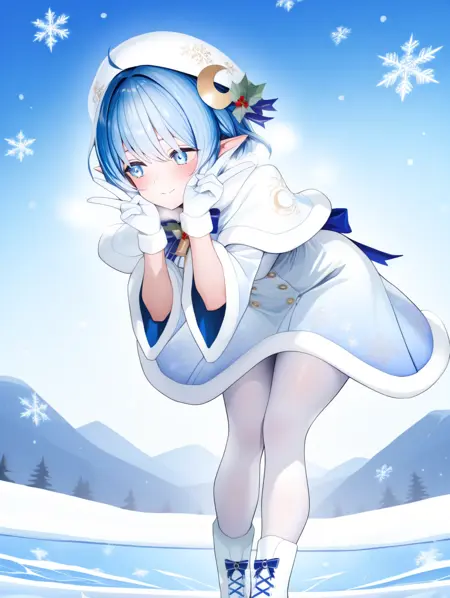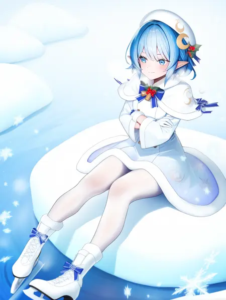 프롬프트 예시: huyu, 파란 머리카락, 파란 눈, 베레모, 초승달 모양 머리 장식, 뾰족한 귀, 작은 망토, 털 장식, 리본, 흰 장갑, 흰 팬티스타킹, 눈꽃, 빙상화, 얼어붙은 호수, 긴 소매, 넓은 소매,