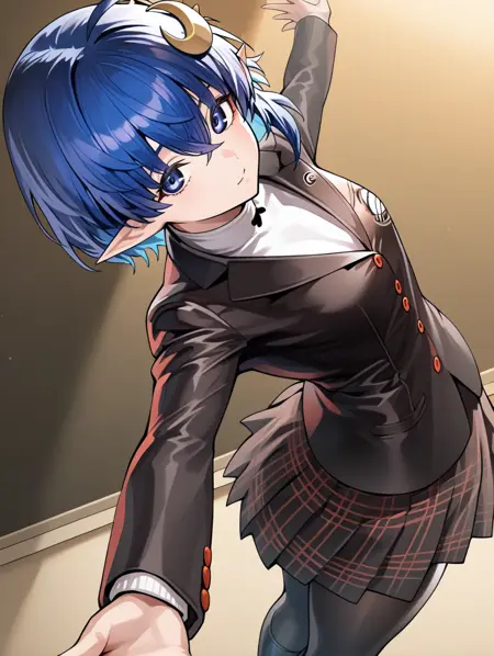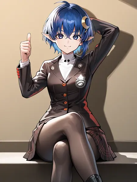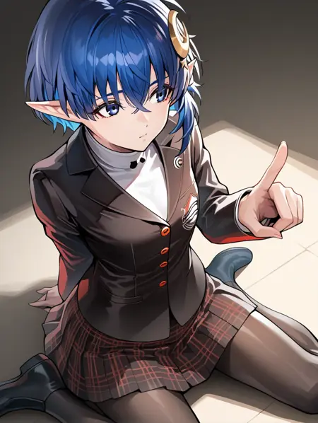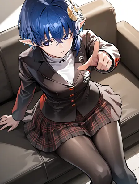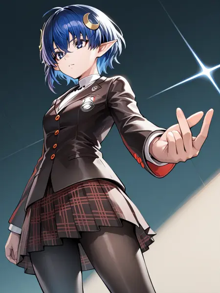 prompt example :gakusei,shuujin academy school uniform,school uniform,pantyhose,pointy ears,blue hair,short hair,blue eyes,plaid skirt,jacket,pleated skirt,crescent hair ornament,