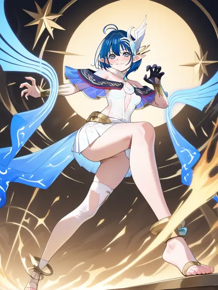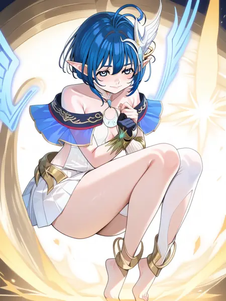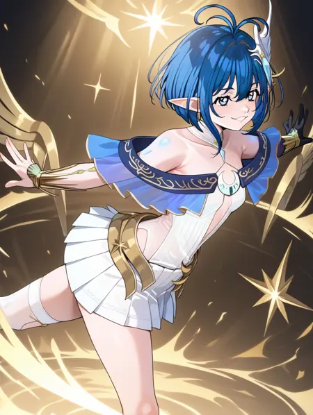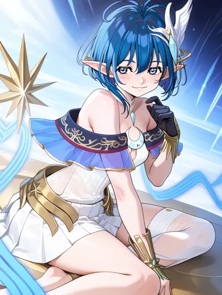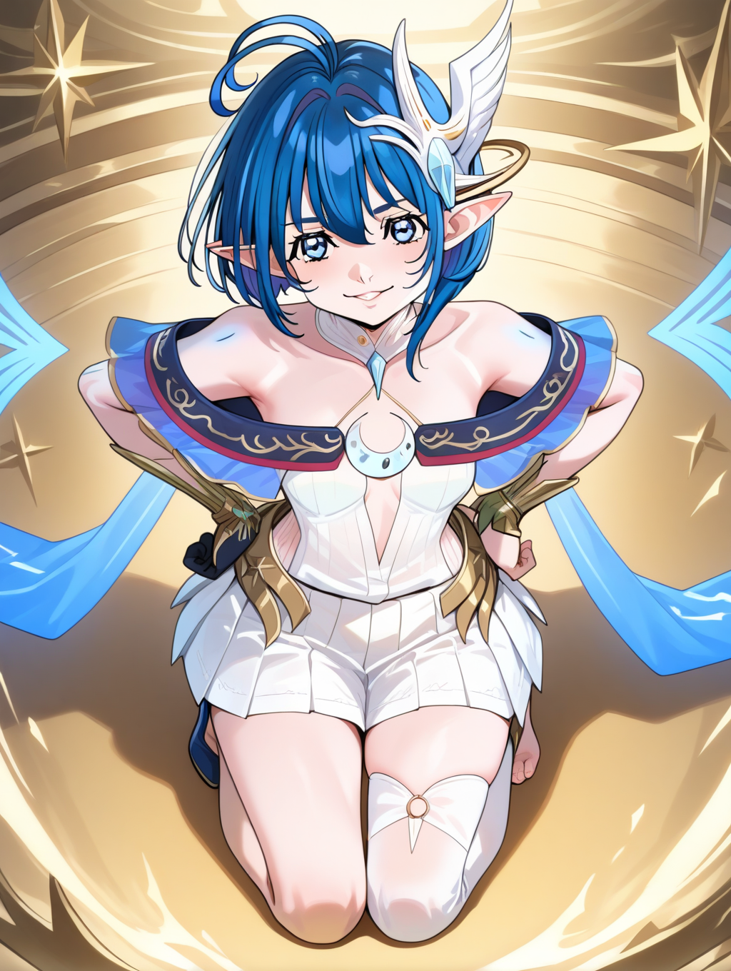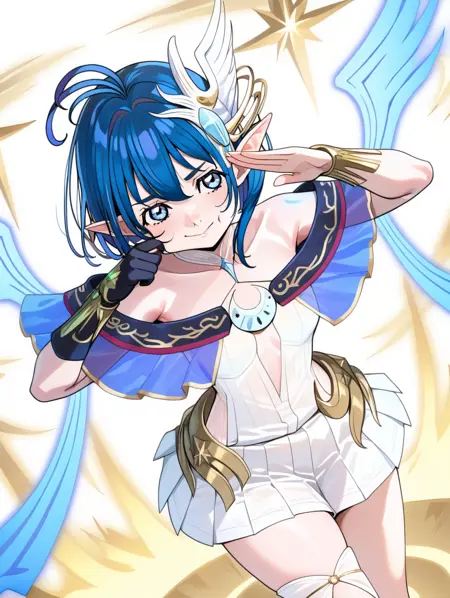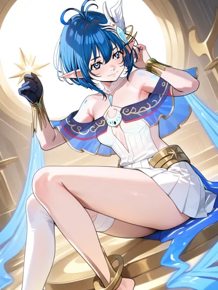 프롬프트 예시: megami, 파란 머리, 파란 눈, 짧은 머리, 머리 장식, 뾰족한 귀, 드러난 어깨, 의상 컷아웃, 주름치마, 한쪽 허벅지 양말, 투명한 카프레트, 한쪽 장갑, 한쪽 드러난 다리,