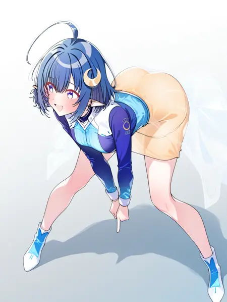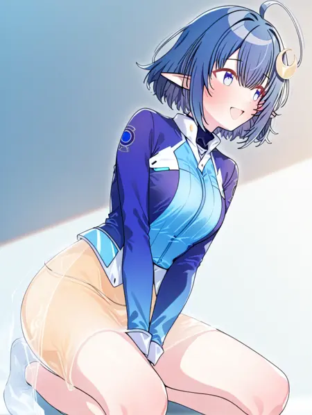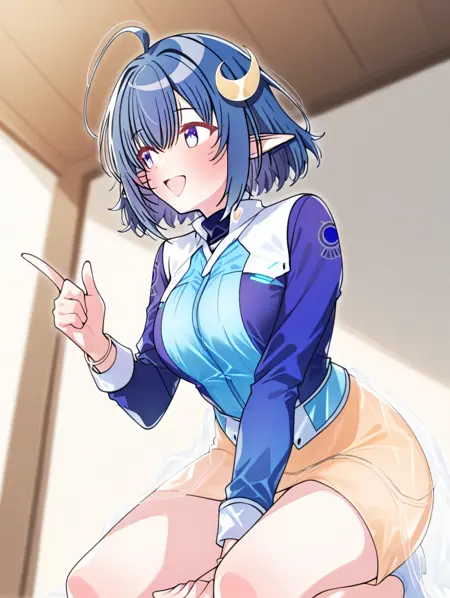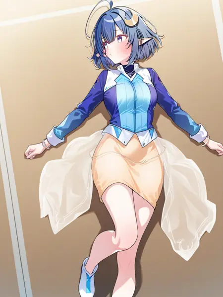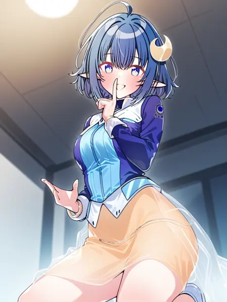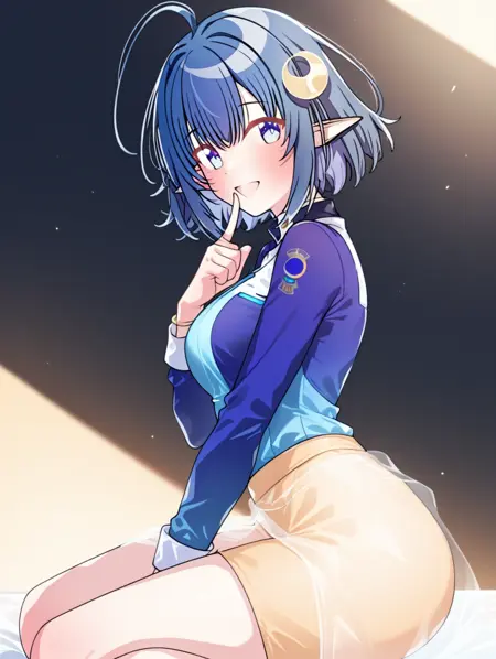 프롬프트 예시: burusufia, 단발, 파란 머리, 달모양 머리 장식, 뾰족한 귀, 파란 셔츠, 긴 소매, 노란 연필 스커트, 투명한 사롱,