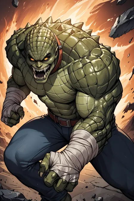 トリガー:Killercroc、うろこ、鋭い歯、筋肉質、爪、破れたズボン、包帯、ベルト、輝く目、首輪、突起