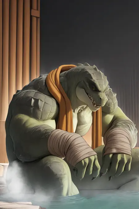 触发词:Killercroc,鳞片,尖牙,肌肉发达,爪子,破烂裤子,绷带,腰带,发光的眼睛,项圈,尖刺