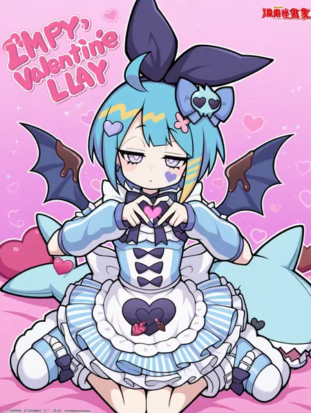 标签(服装 - 情人节服装):食物主题发饰,白色背部蝴蝶结,情人节服装,蓝色指甲,手部创可贴,蓝色发带,竖条纹连衣裙,蓝色恶魔翅膀,青色臂套,青色贴纸,心形面部标记