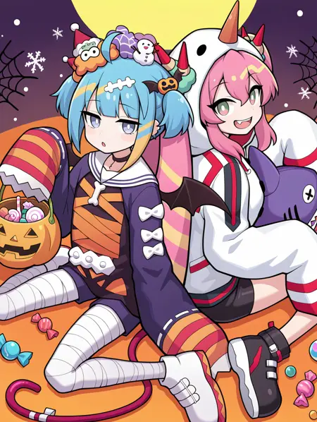 标签(服装 - 万圣节服装):绷带过膝袜,万圣节服装,袖子长过手腕,黑色项圈,官方备用服装,白色运动鞋,水手裙,蓝色短裤,毛绒玩具主题发饰,万圣节糖果桶,黑色恶魔翅膀,万圣节糖果桶