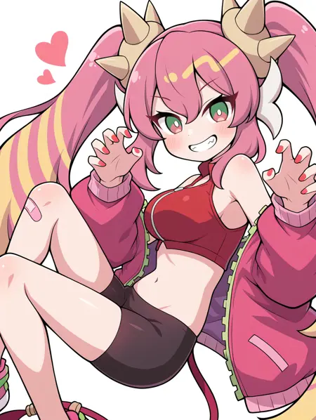 标签(服装1):红色尾巴,粉色夹克,红色短背心,粉色运动鞋,膝盖上的创可贴,黑色骑行短裤,带尖刺的头发装饰