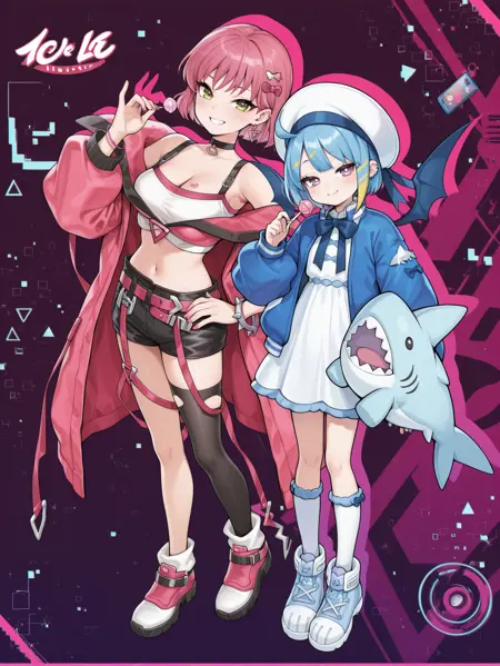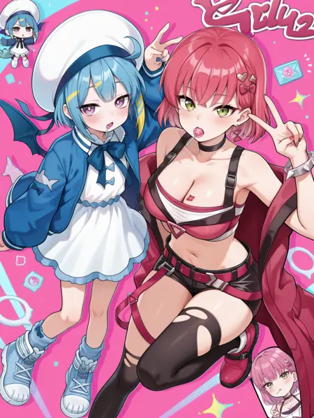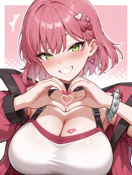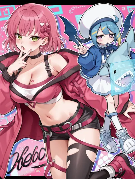 标签(服装1):红色尾巴,粉色夹克,红色短背心,粉色运动鞋,膝盖上的创可贴,黑色骑行短裤,带尖刺的头发装饰