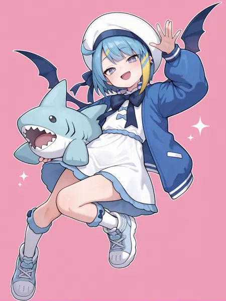 标签(服装1):白色连衣裙,蓝色夹克,白色袜子,白色水手帽,蓝色恶魔翅膀,蓝色运动鞋,蓝色丝带
