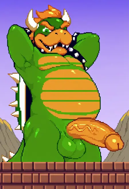 "Bowser, koopa, turtle, scalie, muscular, slightly chubby, bulky, horns, spikes, tail, claws, green shell, orange eyebrows, big fangs, green scales, orange belly, orange hair, orange hair, green eyes, bracelet, collar"