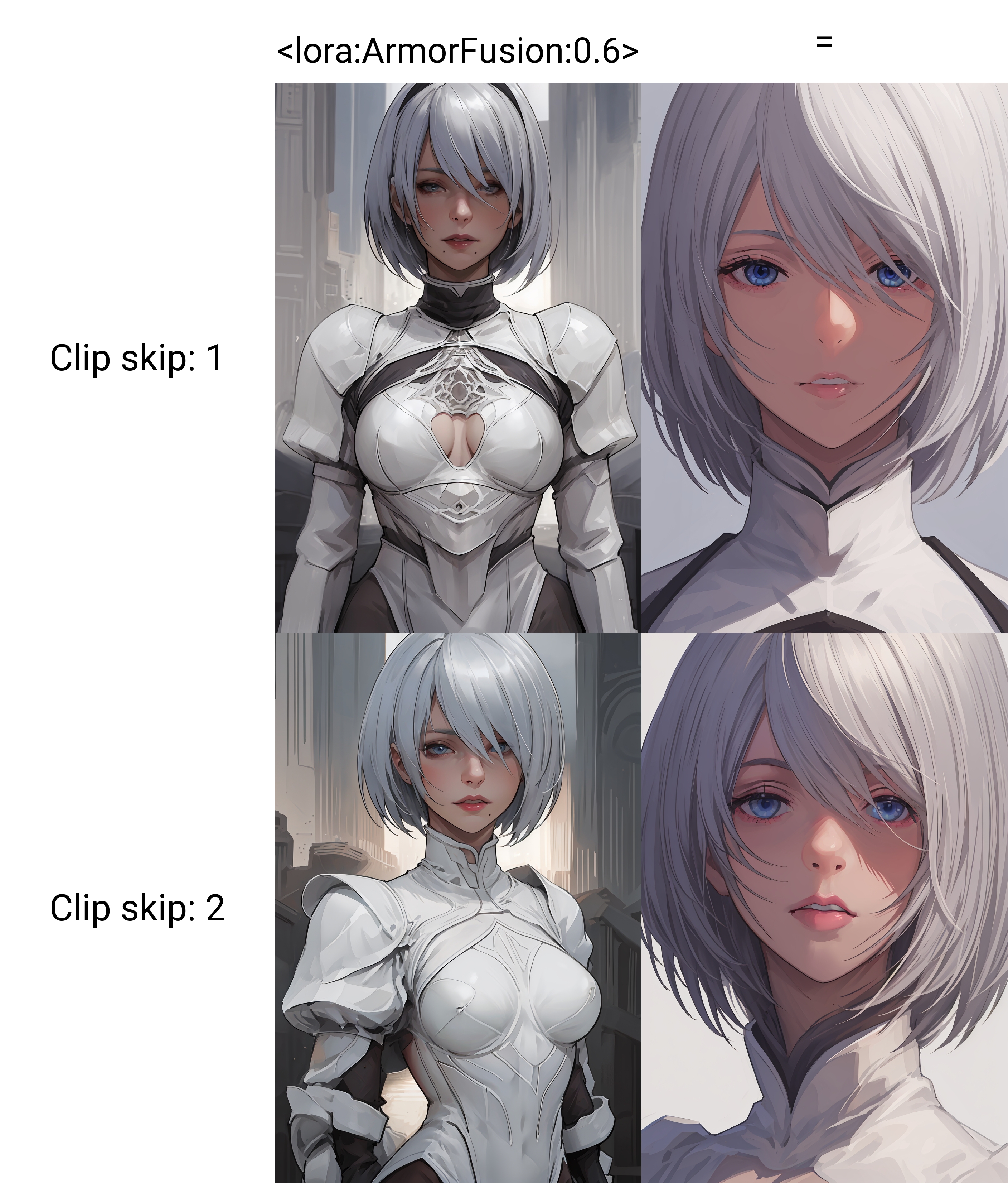 Use it in the range of 0.5 to 1, actually I can not say with certainty that loRA works well in combination with other loRAs, so in some situations you will have to think about the prompt a little longer.Most of the time you'll need the word "armor" to make the loRA work