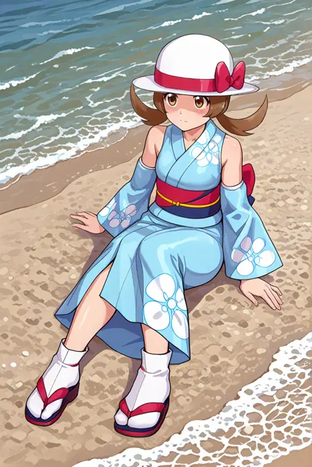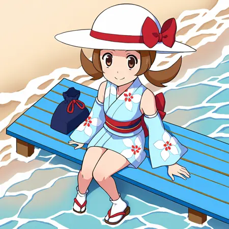 sumlyra, sulyr, 茶色の髪, 茶色の目, ツインテール, 白い帽子, 帽子のリボン, 赤いリボン, おび, 青い着物, 袖なし着物, 別れ袖, 広い袖, 濃紺の帯, 赤い帯, 赤いサンダル, 足袋, 白い靴下