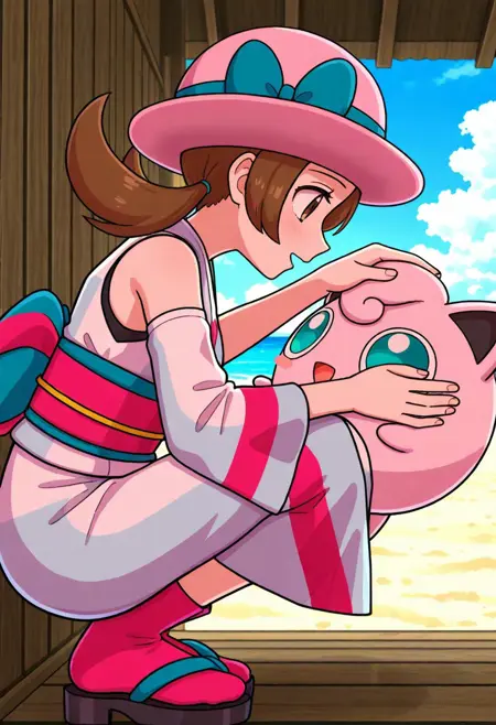 sumlyra, sulyrex, 茶色の髪, 茶色の目, ツインテール, ピンクの帽子, 帽子のリボン, 青いリボン, おび, ピンクの着物, 袖なし着物, 別れ袖, 広い袖, 青い帯, ピンクの帯, 青いサンダル, ピンクの足袋, ピンクの靴下