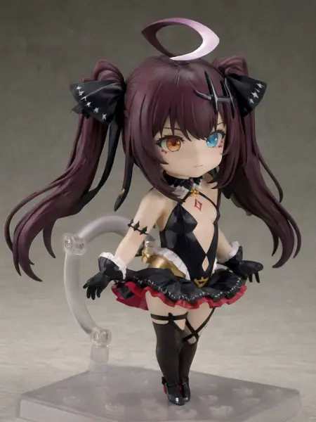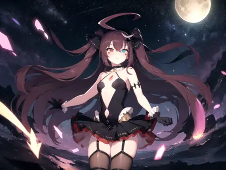 Base Outfit: dsluluca, purple hair, very long hair, two side up, ahoge, heterochromia, hair ornament, black dress, navel cutout, thighhighs, gloves, garter straps