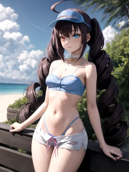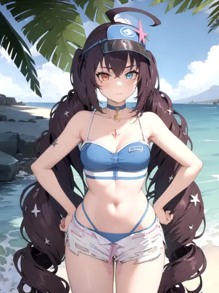 Ocean Breeze Luluca: lulucaswim, purple hair, very long hair, twintails, ahoge, heterochromia, blue bikini, short shorts, visor cap
