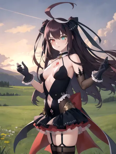 基础装扮:dsluluca,紫色头发,超长发,两侧高束发,呆毛,异色瞳,发饰,黑色连衣裙,露脐设计,过膝袜,手套,吊袜带
