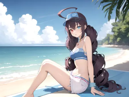 海洋微风Luluca:lulucaswim,紫色头发,超长发,双马尾,呆毛,异色瞳,蓝色比基尼,短裤,遮阳帽