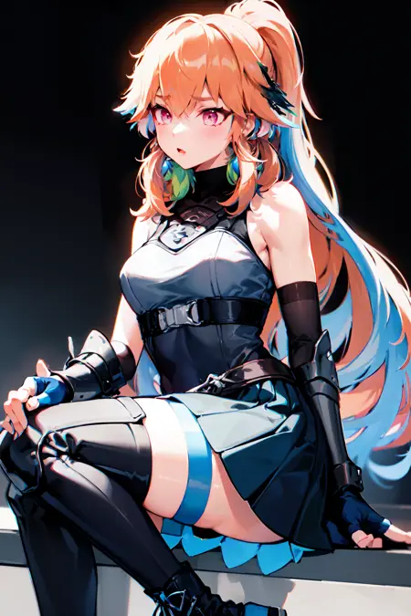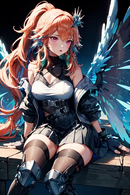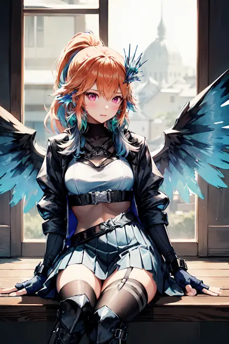 다음은 추가로 유용할 수 있습니다: 긴 머리카락, 보석, 깃털, 장갑, 팔자머리, 깃털 귀걸이, 손가락 없는 장갑, 허벅지까지 오는 양말, 색상이 있는 속머리, 앞머리, 치마, 날개, 재킷, 중간 사이즈의 가슴, 부츠