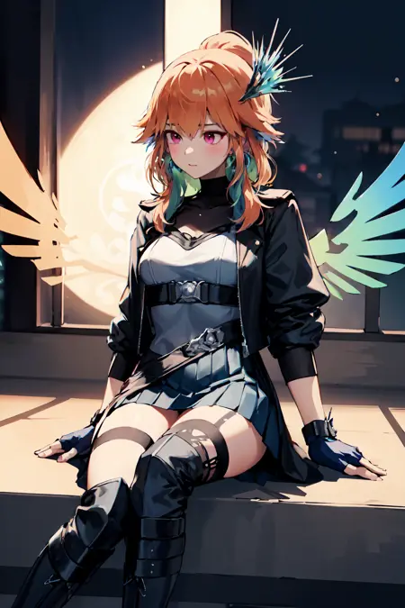 以下内容也可能有帮助:长发、珠宝、羽毛、手套、马尾、羽毛耳环、无指手套、过膝袜、彩色内发、刘海、裙子、翅膀、夹克、中等大小胸部、靴子