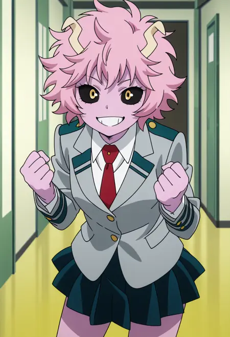 Trained on screenshots from the anime. Removing the "u.a. school uniform" tag when doing her uniform without the blazer is recommended. The skirt tends to be too long, so I recommend adding the "miniskirt" tag, though it may or may not make it too short.