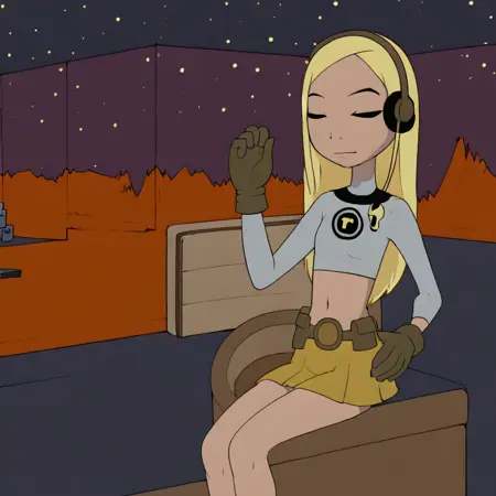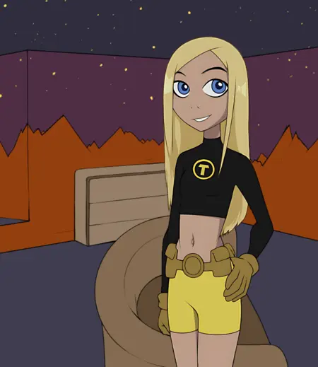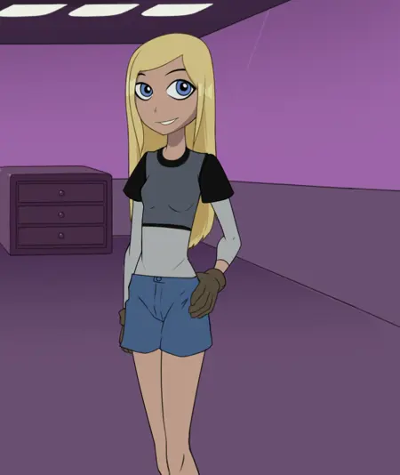 tight black long sleeve, tight yellow shorts, brown belt, brown gloves