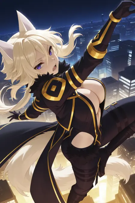 如需表现她典型形象,请添加 "黑色紧身衣、黑色外套、金色镶边、露胸、中央开衩、服装剪裁、毛皮镶边、黑色手套、黑色长裤、黑色靴子"。