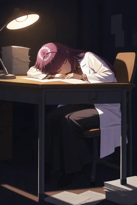 若要表现她的休闲装,请添加 "白色实验服、棕色衬衫、有领衬衫、黑色裙子、长裙"。