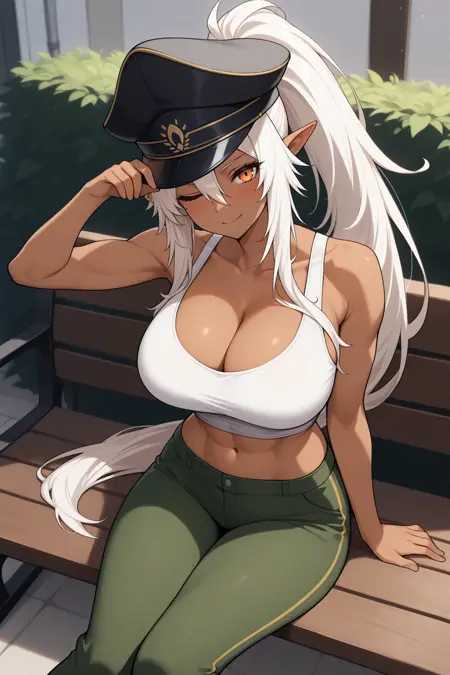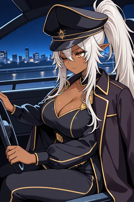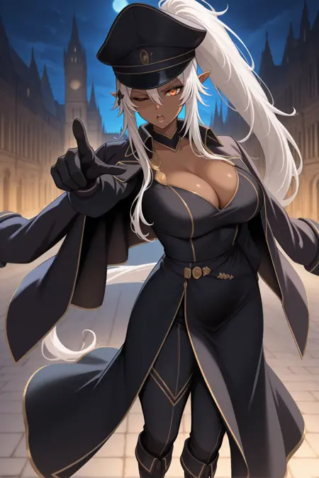 Add "peaked cap, black hat, black jacket on shoulders, gold trim, cleavage, black dress, belt, black pants" for her typical look.