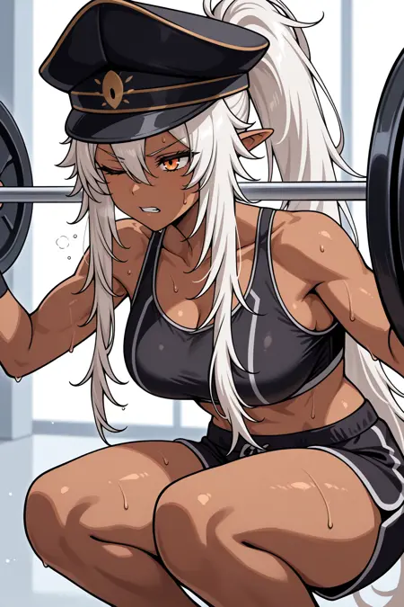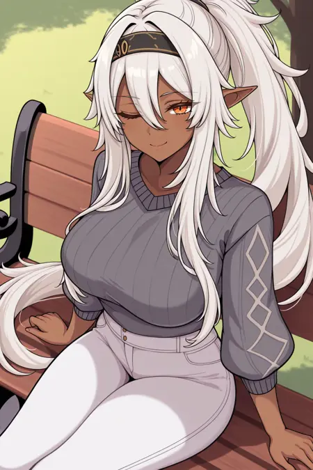Trigger word is "sdl4mbda" and "dark-skinned female, white hair, hair between eyes, ponytail, very long hair, orange eyes, pointy ears, one eye closed" is required.