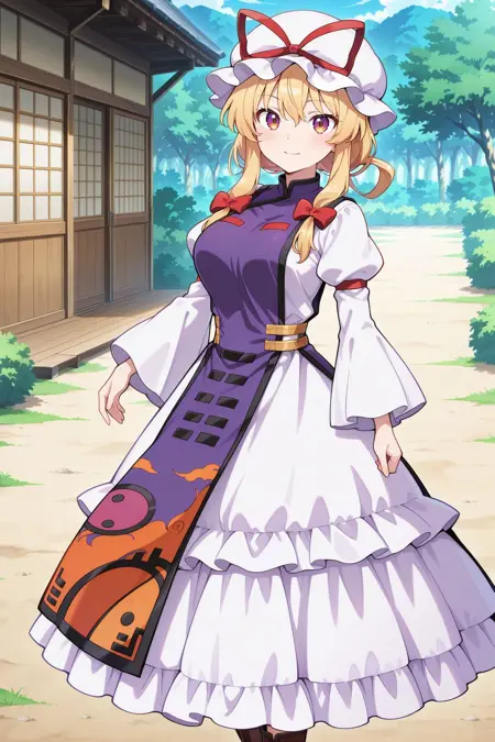 yakumo yukari, 1girl, solo, yellow eyes, blonde hair, low twintails, large breasts,, yakumo yukari \(youkai that lurks in fantasy\), alternate costume, mob cap, hat ribbon, red ribbon, hair bow, red bow, white dress, frilled dress, purple tabard, puffy long sleeves, juliet sleeves, wide sleeves, brown boots,