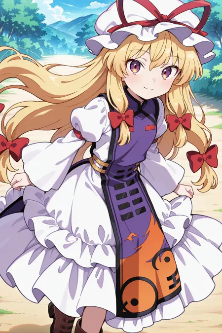 yakumo yukari, 1girl, solo, yellow eyes, blonde hair, very long hair, low twintails, aged down,, yakumo yukari \(tiny great youkai\), alternate costume, mob cap, hat ribbon, red ribbon, multiple hair bows, red bow, white dress, frilled dress, purple tabard, puffy long sleeves, juliet sleeves, wide sleeves, brown boots,