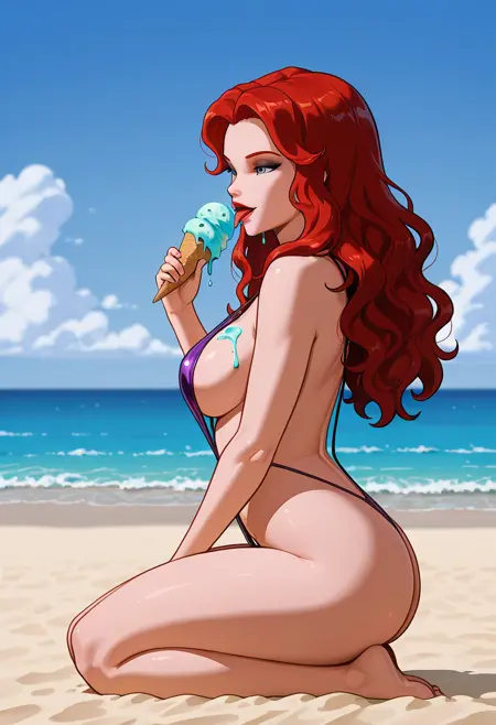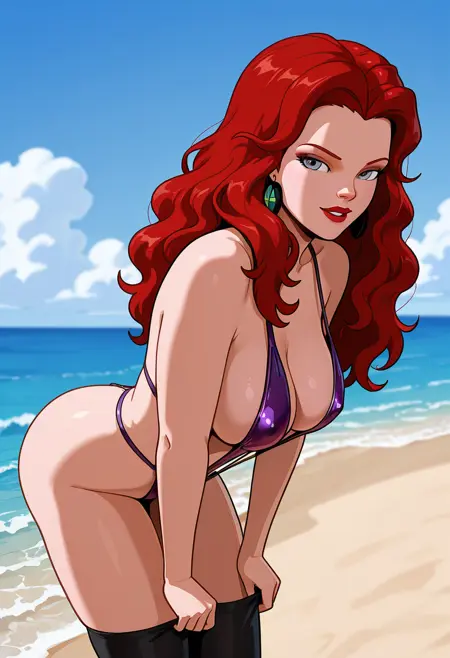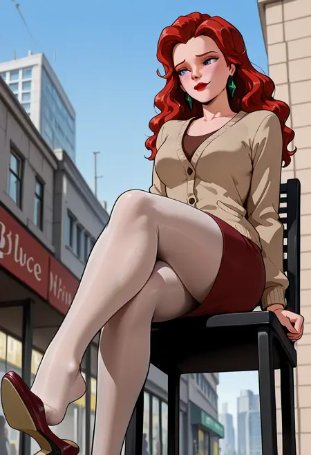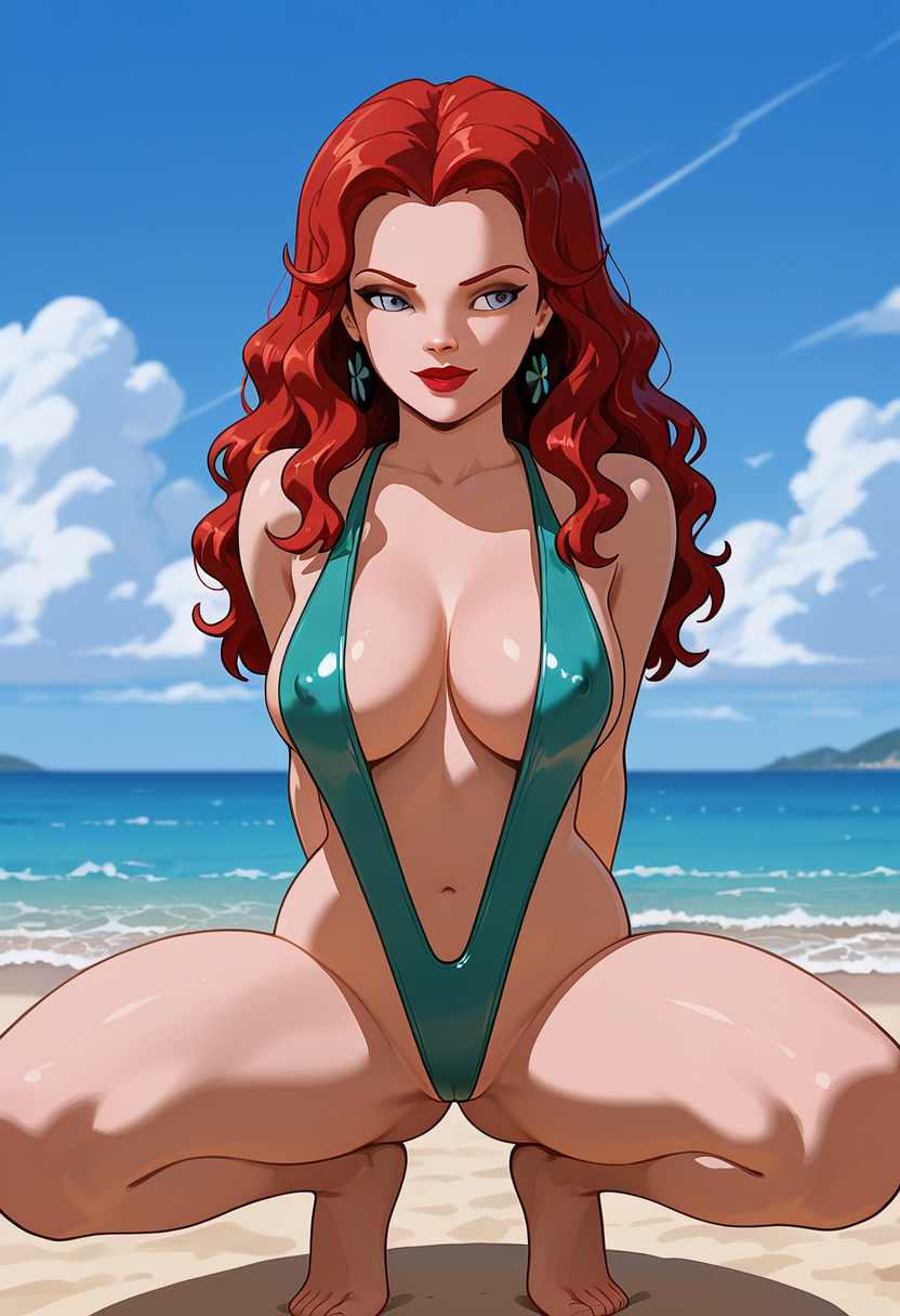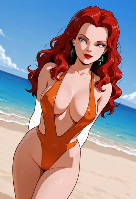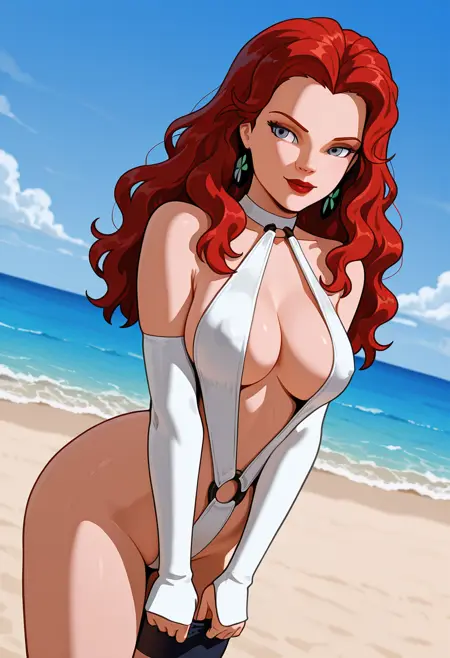 (blue_eyes,grey_eyes,red_hair,long_hair,wavy_hair,makeup:1.2),