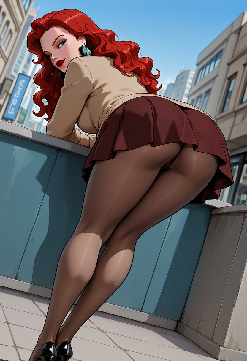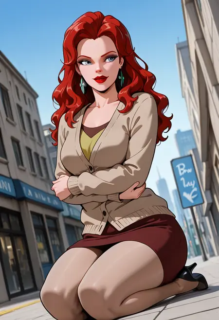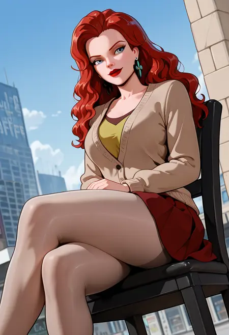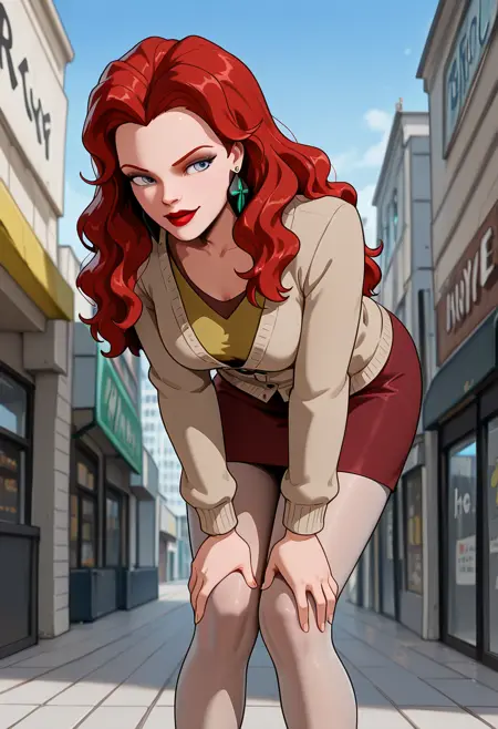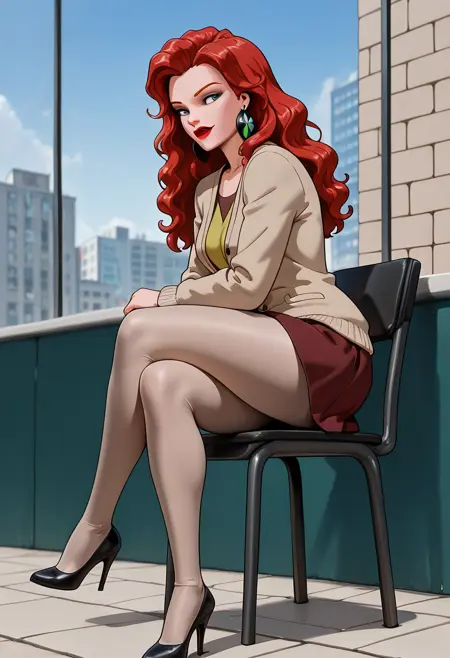 (shirt,skirt,long_sleeves,cardigan,brown_cardigan,short_red_skirt,yellow_shirt,brown_shirt,lipstick,red_lips,jewelry,earrings,jacket,brown_jacket),highheels, beige_pantyhose,