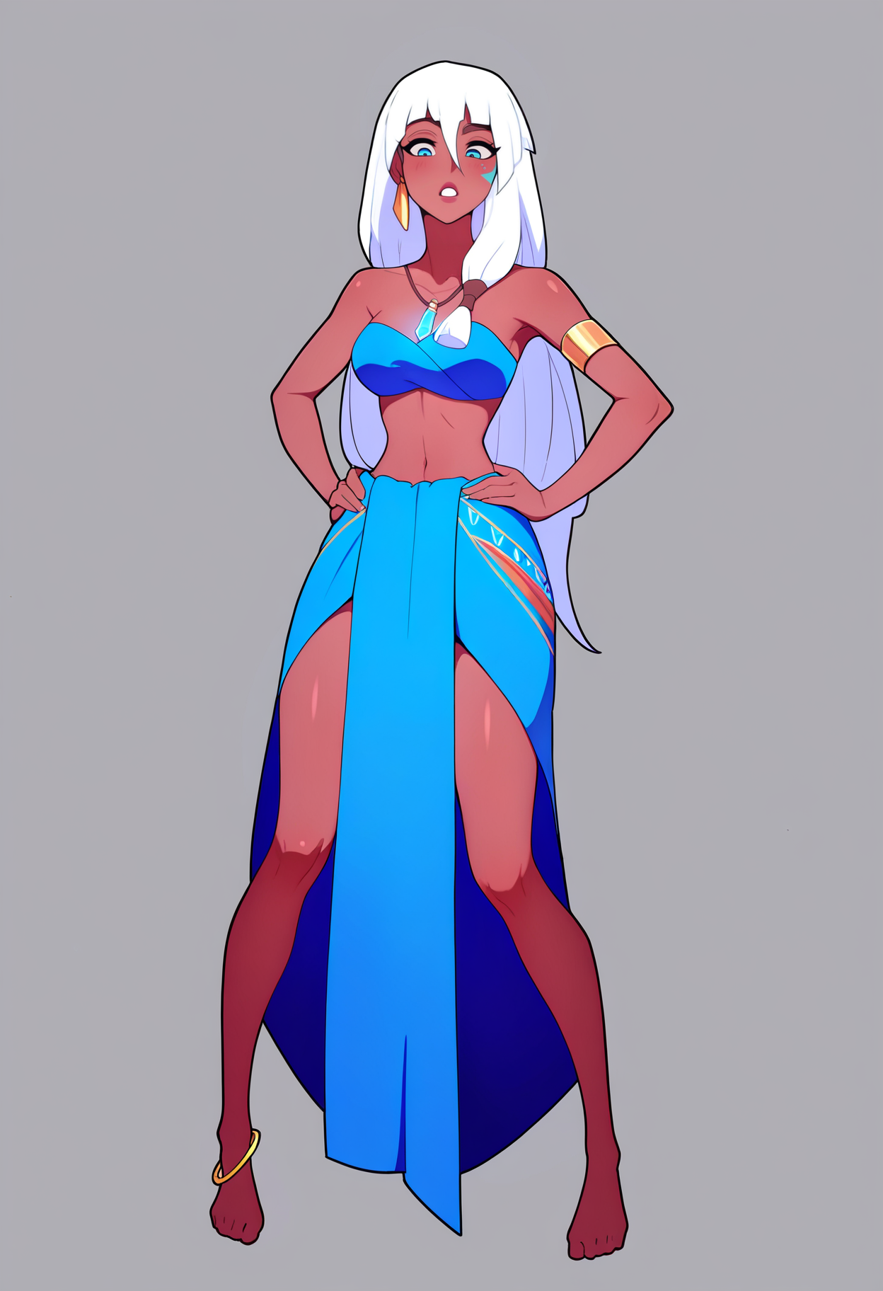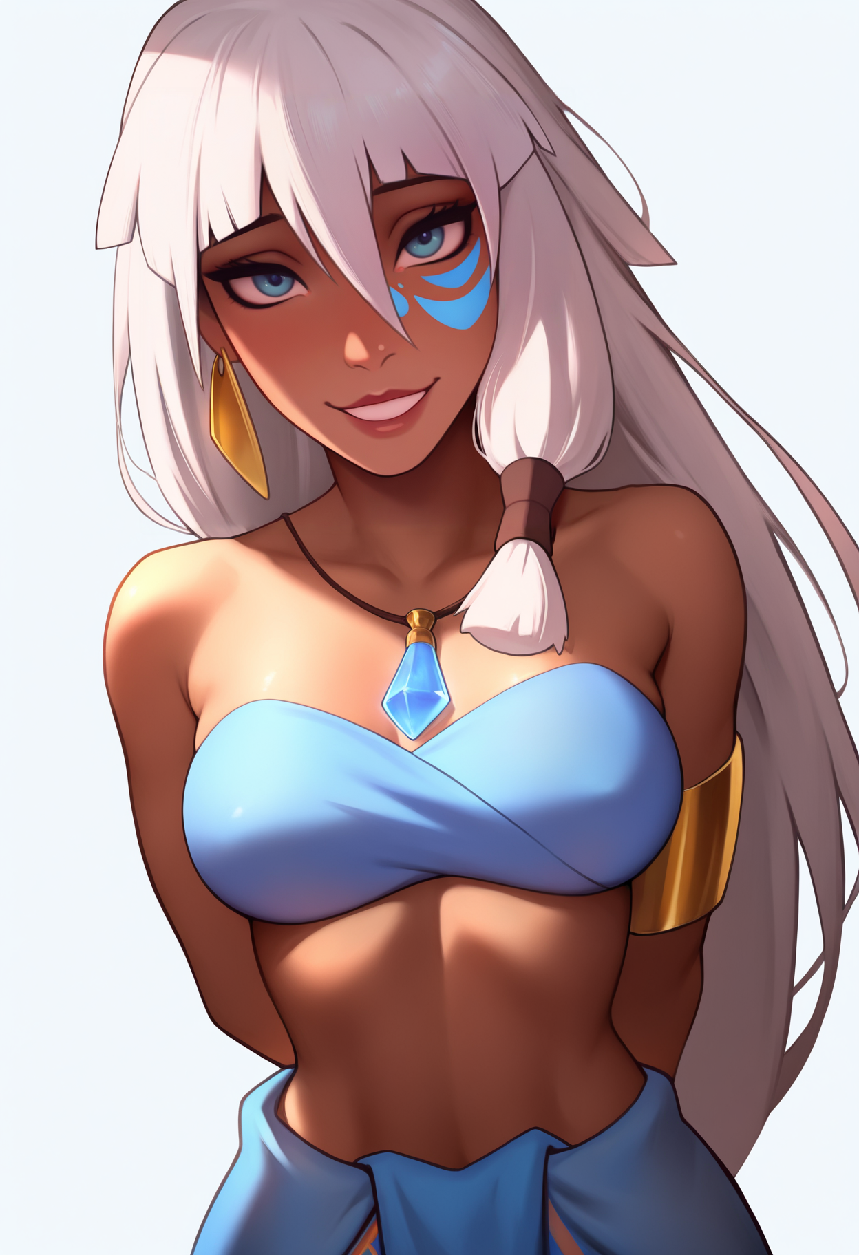 기본 프롬프트: 1girl, kidagakash, blue eyes, white hair, long hair, dark skin, facial mark