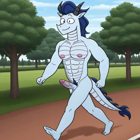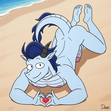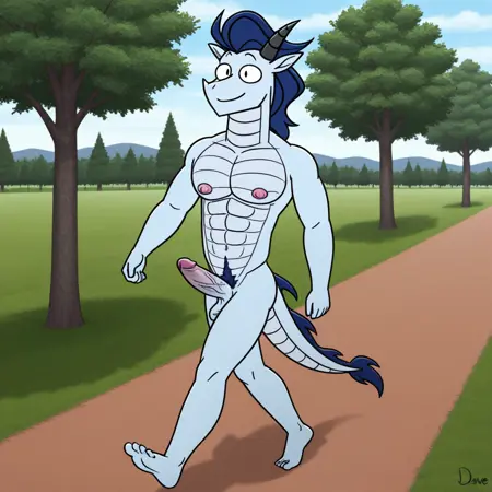 dave, dragon, solo, (1boy), horns, blue hair, anthro, tail, nipples, pecs, muscular, feet, soles, blue body,