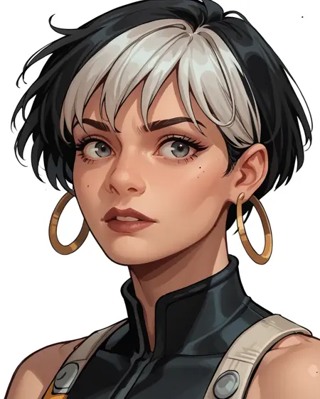 Triggers: two-tone hair, short hair, white hair, black hair, short dress, gloves, boots
