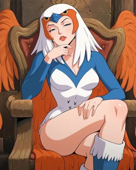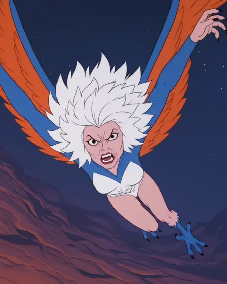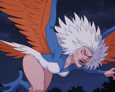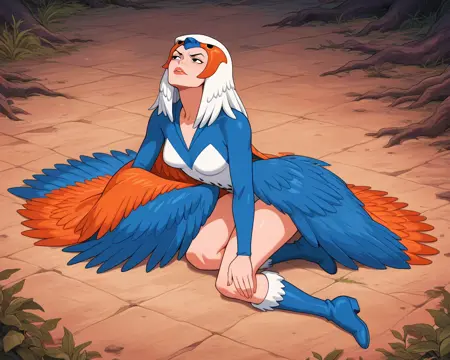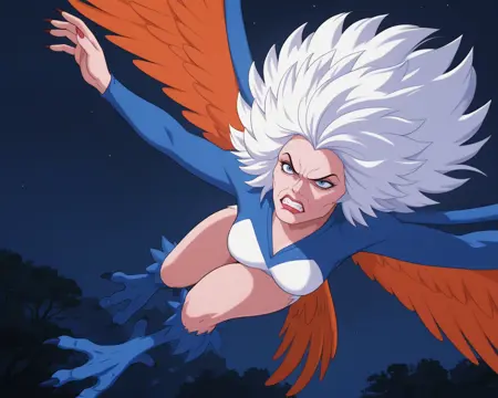 1girl, solo, motu_sorc, sorc_hrpy, white hair, messy hair, angry, cheekbones, blue white leotard, orange and blue feather wings, blue talons, orange tail feathers, evil