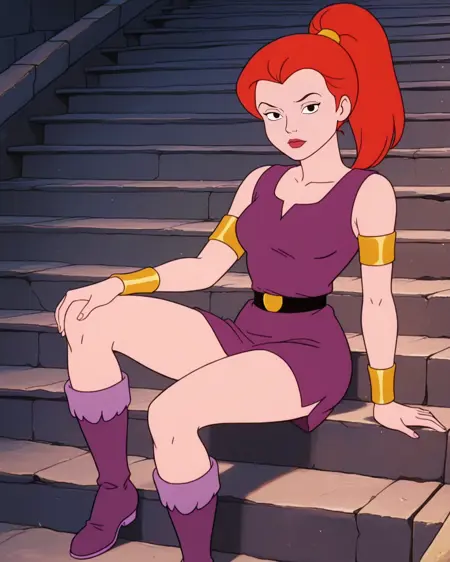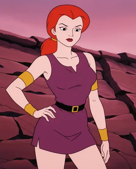 1girl, solo, motu_sorc, teelana, red hair, ponytail, blue eyes, purple tunic, black belt, gold armbands, gold bracelets, white furred boots