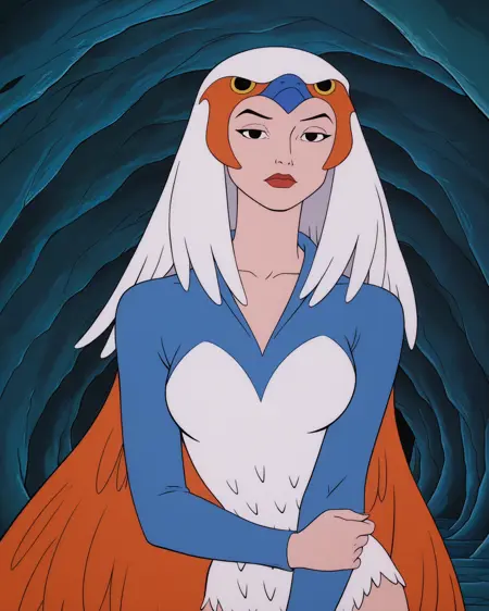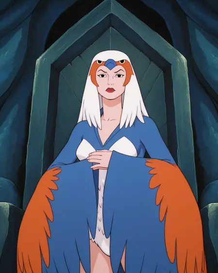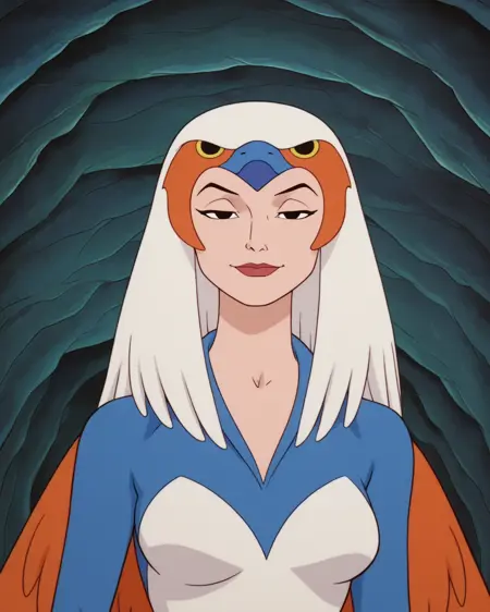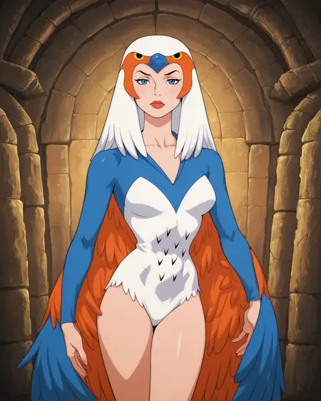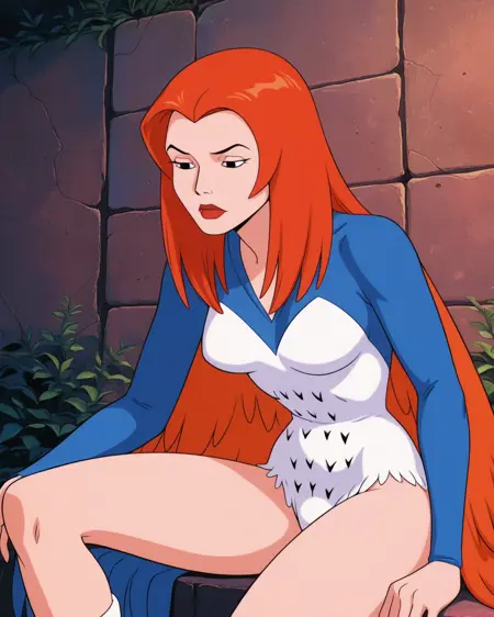 彼女が赤髪であることが後で明らかになる(フィルメーションのすべての女性キャラクターは赤髪だった…)。ただし、トレーニングデータでは赤髪は魔女になる前のテエラナの形態でのみ使用されている。その副作用として、ハーピー形態では髪を設定しているため、追加のヘルパーなしで「red hair, hair down, straight hair」などを使用せずとも、乱れたハーピーの髪が生成される。