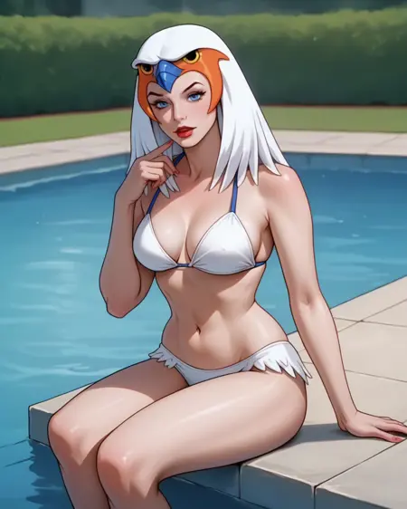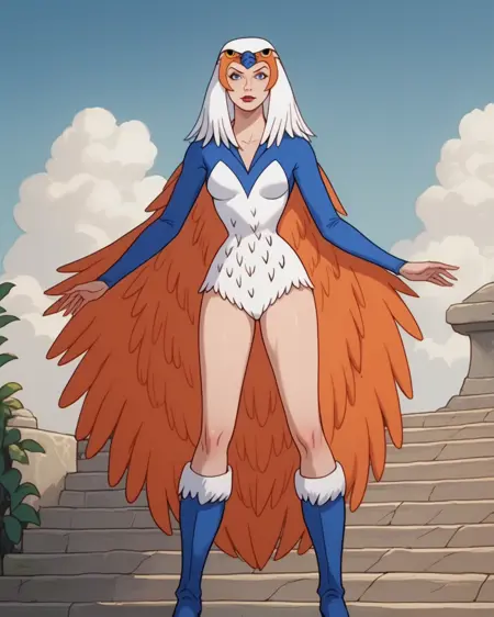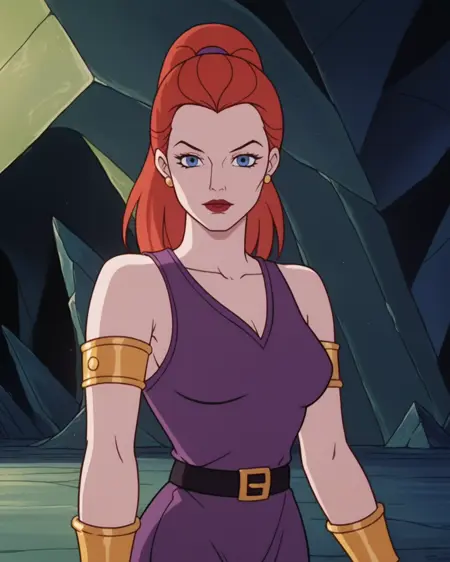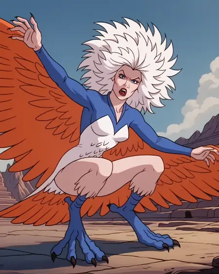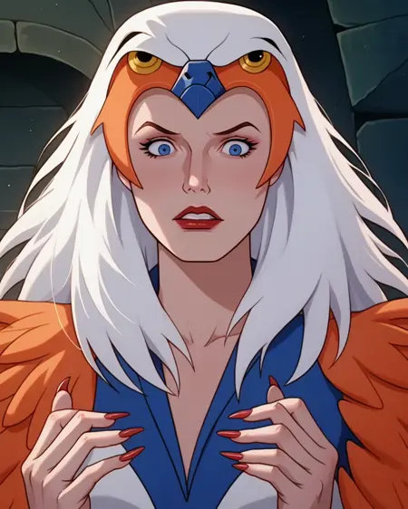 在某一时刻揭示她拥有红发(所有Filmation女性角色都拥有红发……),但训练中仅在Teela-Na的非女巫形态中出现过。然而,一个副作用是我为鹰身女妖版本使用了头发,因此它会自动生成凌乱的鹰身女妖头发,而无需额外辅助词,例如:“red hair, hair down, straight hair”。