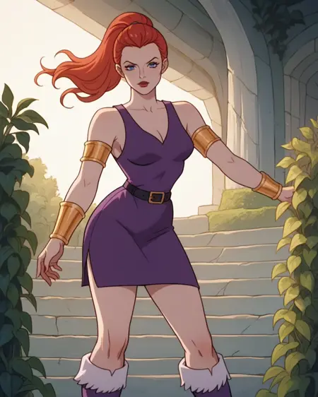 1girl, solo, motu_sorc, teelana, 红发, 马尾辫, 蓝眼睛, 紫色束腰外衣, 黑色腰带, 金色臂环, 金色手镯, 白色毛茸茸的靴子