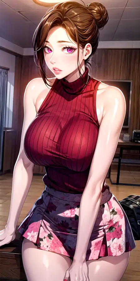 치마, 혼자, 갈색 머리, 소매 없음, 가방, 셔츠, 플로럴 무늬 치마, 어깨 드러냄, 빨간 스웨터, 짧은 머리, 셔츠를 넣음