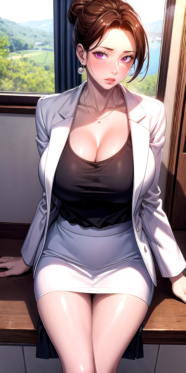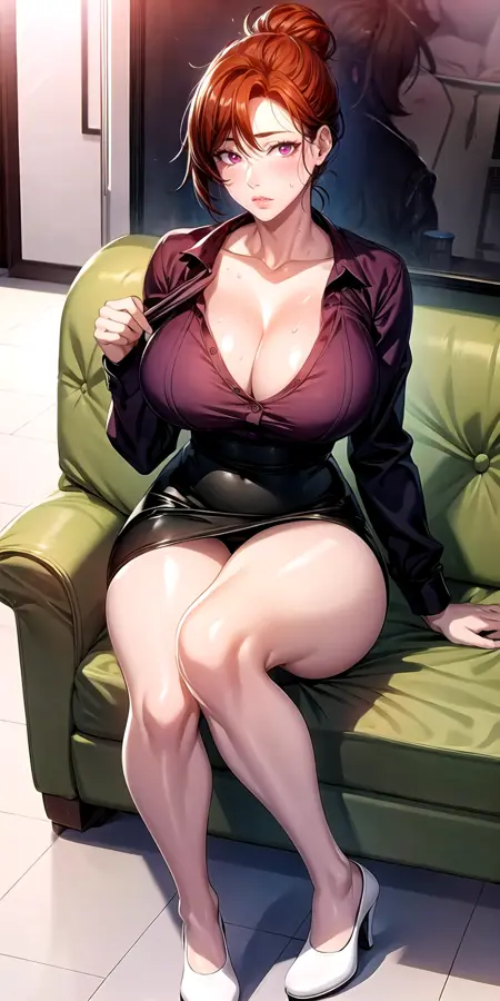 검정 치마, 볼빨간, 허리 높은 치마, 셔츠, 갈색 셔츠, collarbone, 치마 당기기, 속옷, 연필 치마, 흰색 하이힐, 미니 스커트, 긴 소매, 앞단추 치마