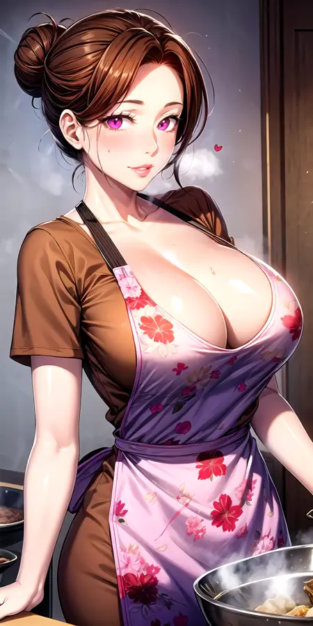 갈색 셔츠, 플로럴 무늬 앞치마, 성숙한 여성, 볼빨간, 옷 전체 착용, 짧은 소매