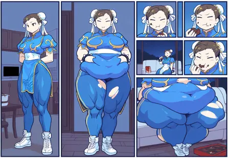实验性提示词: 腹部膨胀、胸部膨胀、臀部膨胀、体重增加漫画、苗条到肥胖、苗条到变胖,