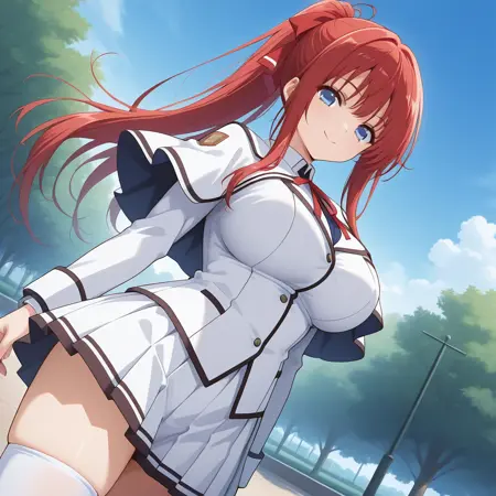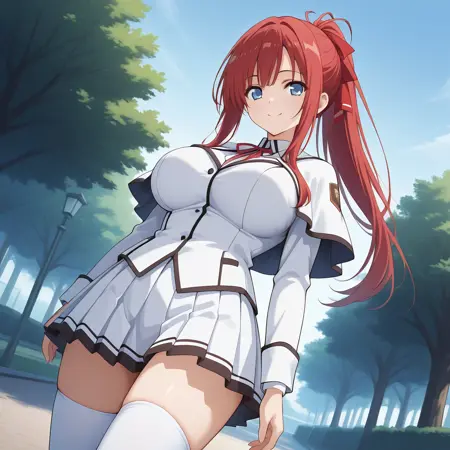 サンプルプロンプト: mikoto, 大きな胸, 青い目, 赤髪, 長髪, ポニーテール, 横髪, 前髪, 白い髪リボン, 学校制服, ケープレット, 白いジャケット, 赤いリボン, 白い太ももハイズ, プリーツスカート, 白いスカート,
