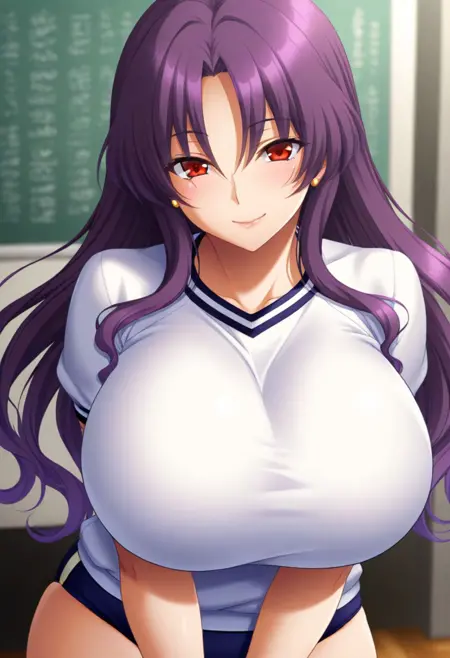 anju, 1girl, purple hair,long hair,red eyes,huge breasts